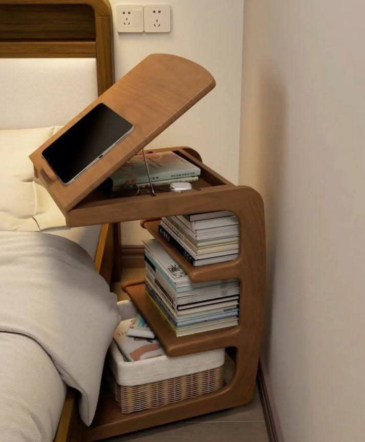 طاولة جانبية ذكية من الخشب الطبيعي – كل ما تحتاجه بجانب سريرك
